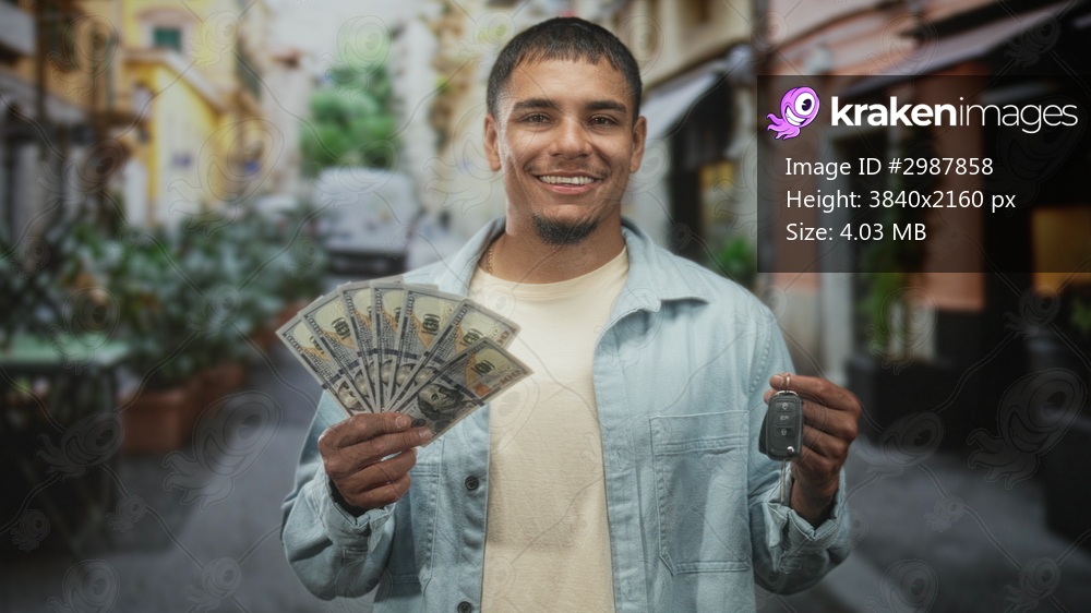 Man holding a fanned stack of us dollars in one hand and car keys in the other, smiling in a narrow street cafe lane; confidence success.