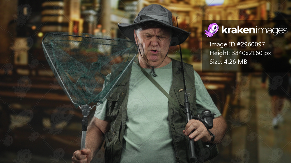 Man holding a fishing net and rod inside a building, grimacing while gripping tackle with hat and vest; determination exploration.
