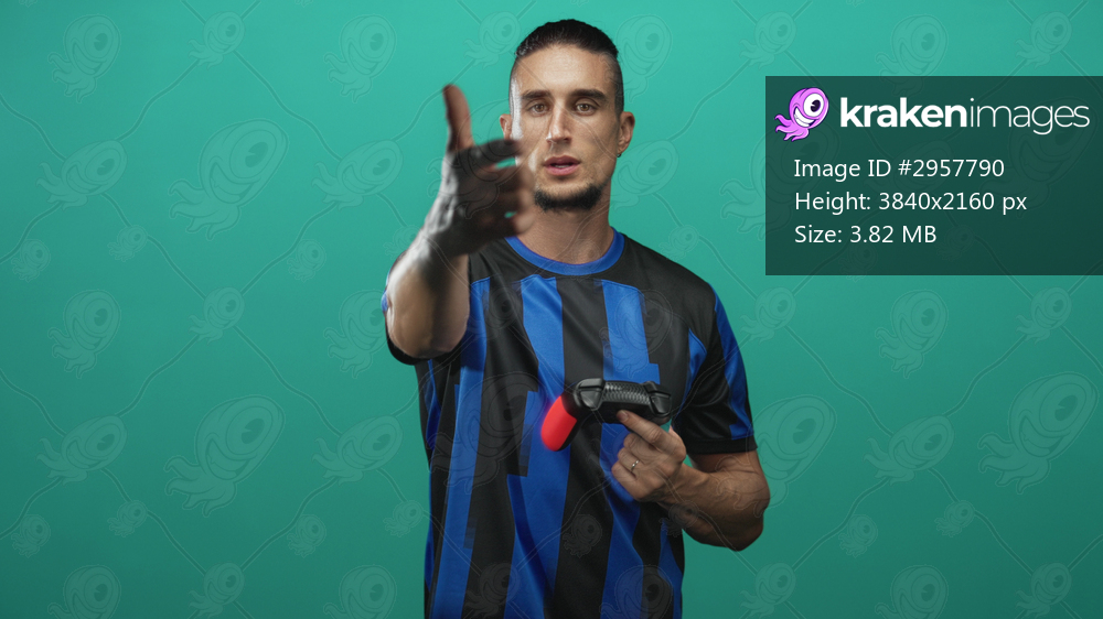 Man holding a gamepad and pointing with hand toward camera while wearing a blue soccer jersey in studio; focused competition.