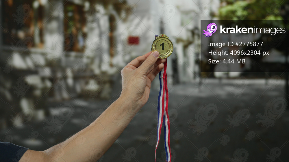 Man holding a gold medal with a number one in the city street, showcasing achievement and success in an outdoor urban setting during daytime.