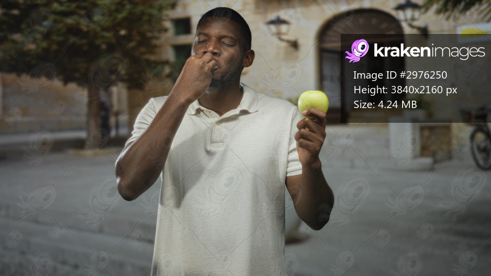 Man holding a green apple, hand to mouth as he bites and smiles on a sunlit street plaza with stone building archway and bicycle nearby; joy healthy eating. - Kraken Images