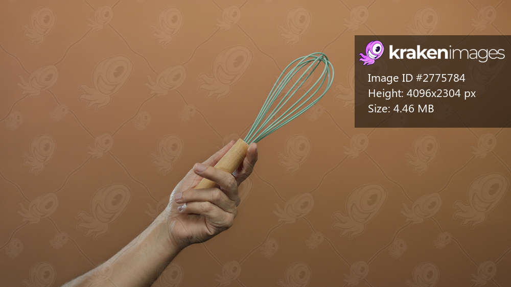 Man holding a green whisk against a brown wall background, showcasing kitchen tools in a minimalist setting with isolated focus on the caucasian male hand and utensil. - Kraken Images