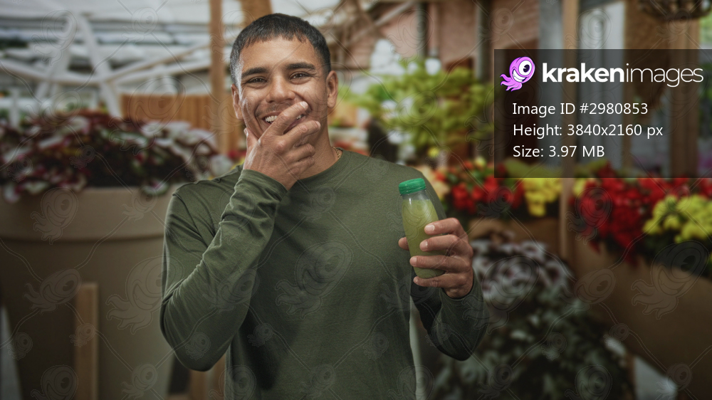 Man holding a juice bottle, hand to mouth gesture in building greenhouse filled with plants and flowers; joyful refreshment.