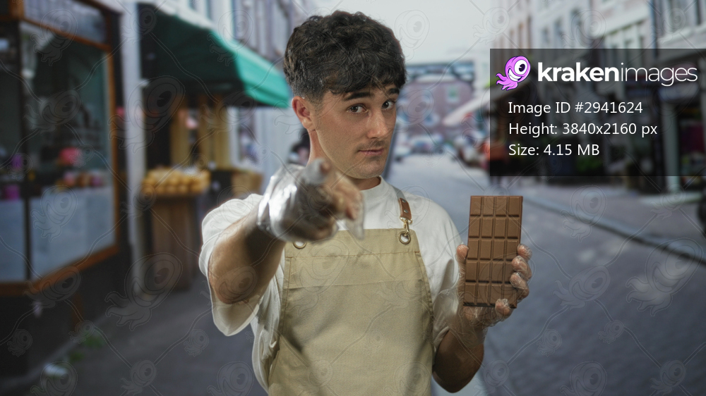 Man holding a large chocolate bar on a city street points finger to head with plastic gloves and neutral expression; thoughtful product pitch.