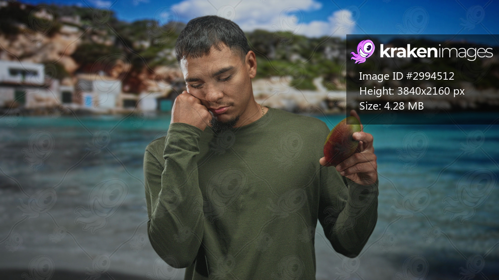 Man holding a mango and rubbing his forehead in a studio with a beach backdrop, olive shirt visible; contemplation.