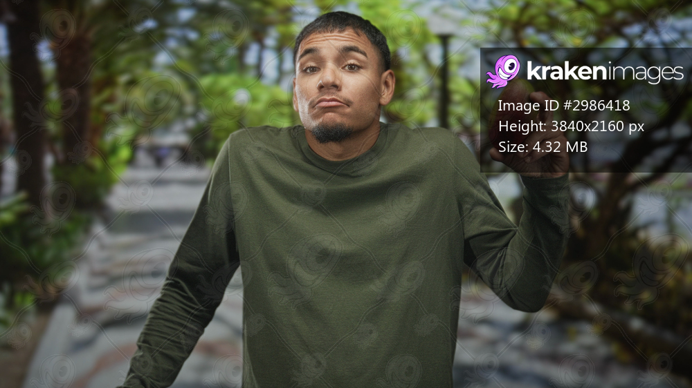 Man holding a mango while shrugging on a tree lined street, wearing a green long sleeve shirt and casual pose; uncertainty.