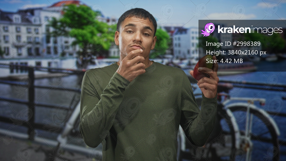 Man holding a mango while touching his chin on a canal street by a bicycle and railing, gazing at the fruit; thoughtful curiosity decision.