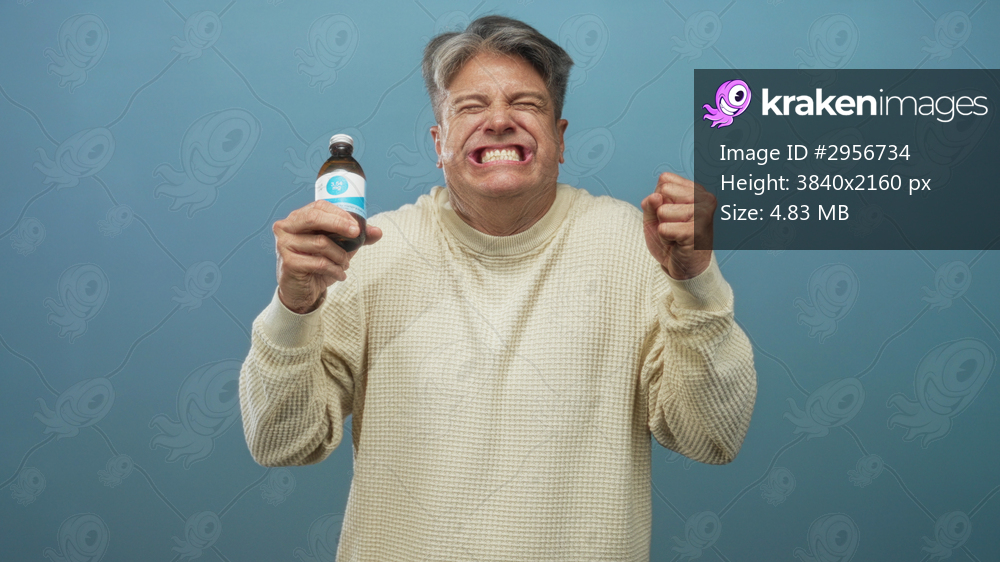 Man holding a medicine bottle with grimace, gagging and clutching bottle with both hands against plain blue studio backdrop; disgust caution.