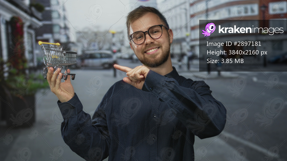 Man holding a miniature shopping cart in one hand and points finger at it on a busy city street while smiling and giving a thumbs up; confidence.