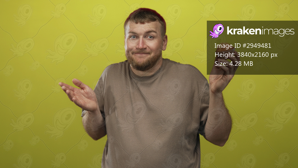 Man holding a muffin, slightly shrugging and covering mouth in studio against lime green wall; uncertainty.