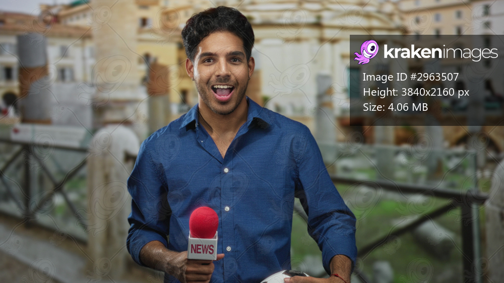 Man holding a news microphone and a soccer ball while smiling and speaking in a building; live sports excitement.