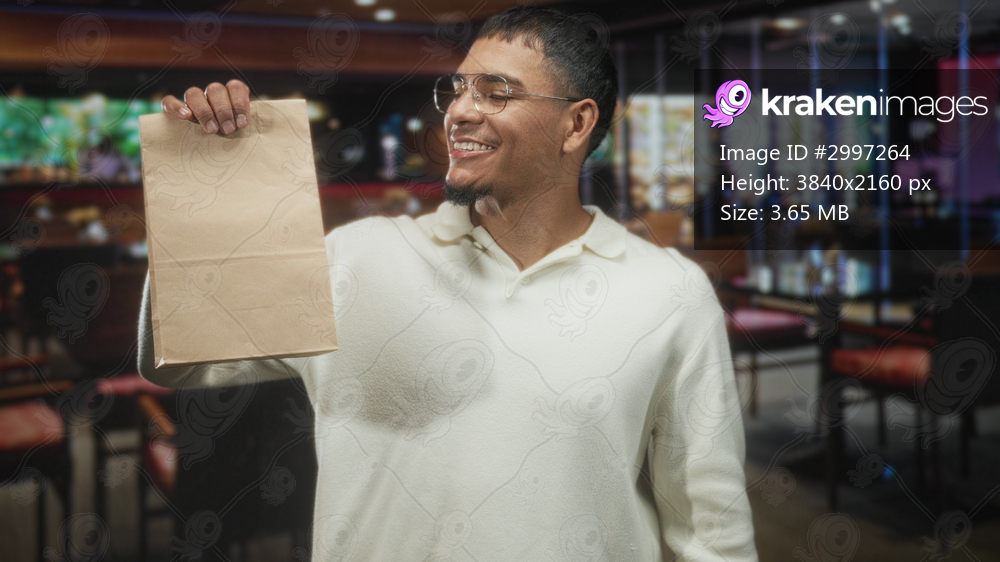 Man holding a paper bag with his hand raised, smiling while presenting a takeout order in a building; friendly service.
