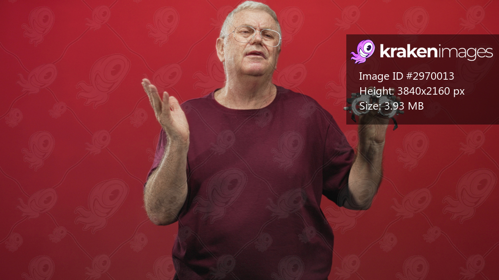 Man holding a phoropter trial frame and gesturing with hand during eyeglasses examination against a red backdrop in studio; uncertainty.
