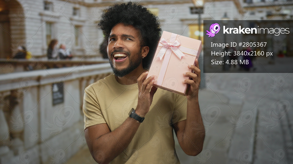 Man holding a pink gift box with a ribbon standing in an outdoor city street with blurred background showcasing urban life.