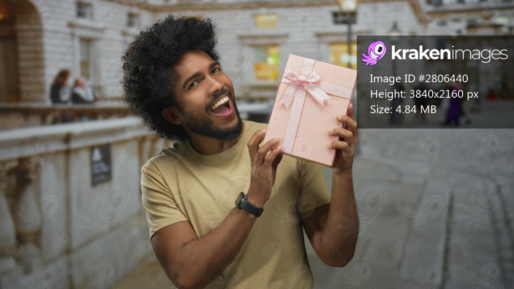 Man holding a pink gift box with a ribbon standing in an outdoor city street with blurred background showcasing urban life.