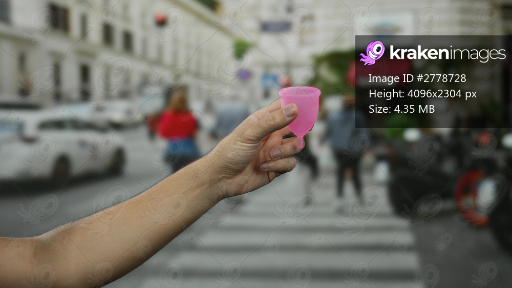 Man holding a pink menstrual cup on a busy city street, showcasing eco-friendly lifestyle in a vibrant urban setting with diverse pedestrians in the background. - Kraken Images