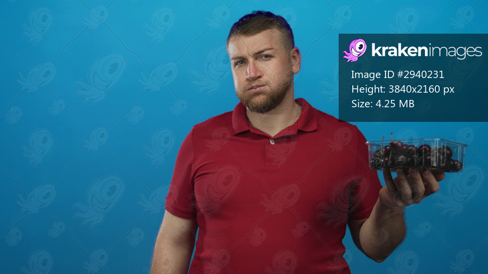 Man holding a plastic container of cherries in a blue studio wearing red polo shirt and looking bemused; healthy snack amusement.