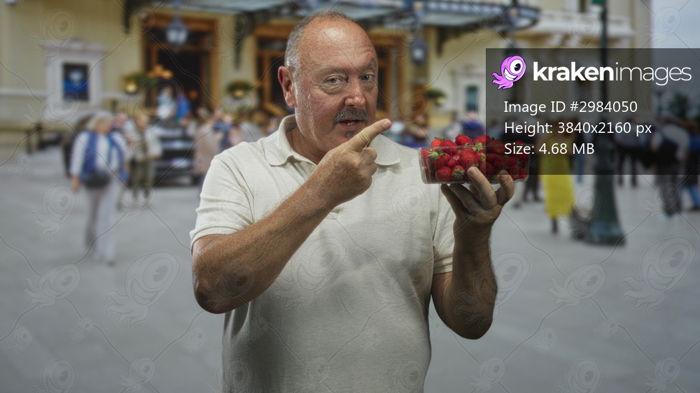 Man holding a plastic container of strawberries points finger directly at viewer on a crowded street; warmth sharing.