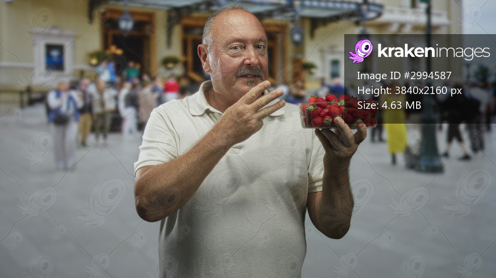 Man holding a plastic container of strawberries points finger directly at viewer on a crowded street; warmth sharing.