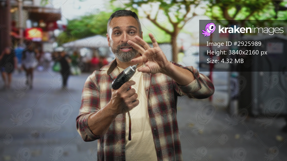 Man holding a power drill, finger pointing to the drill bit while inspecting it on a busy street; focused repair demo.