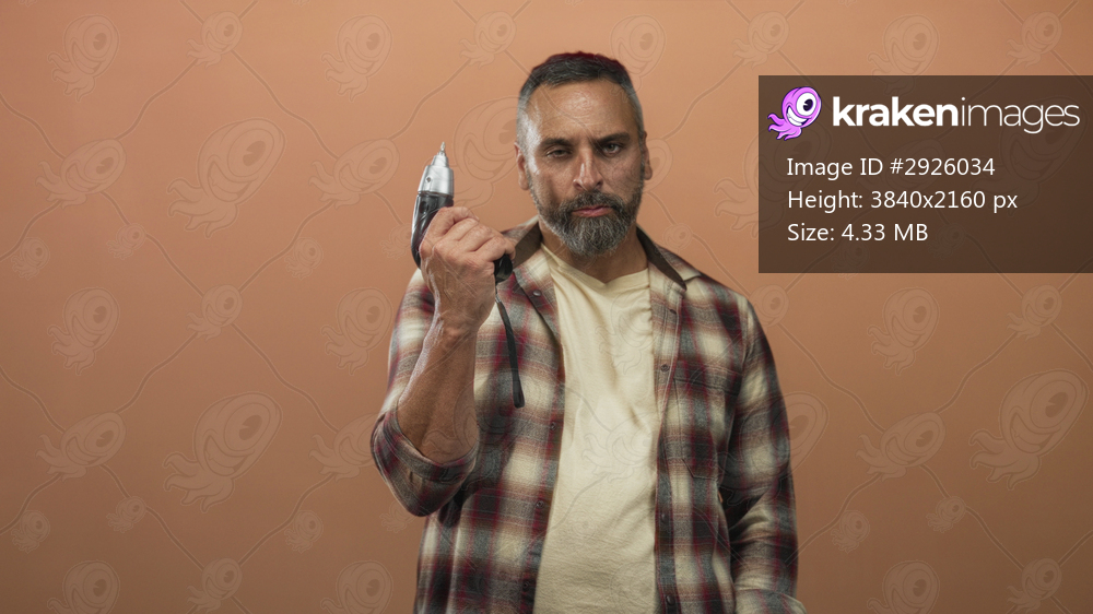 Man holding a power drill, hand gripping the tool in a studio with terracotta wall; confidence craftsmanship.