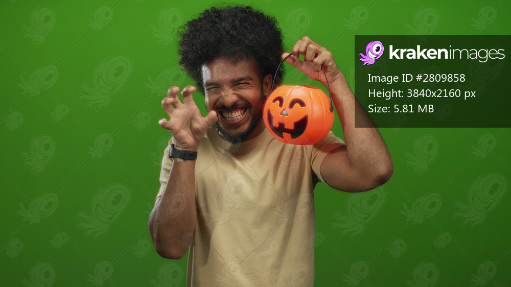 Man holding a pumpkin basket with a playful gesture against a green background, capturing a festive and joyful halloween atmosphere.