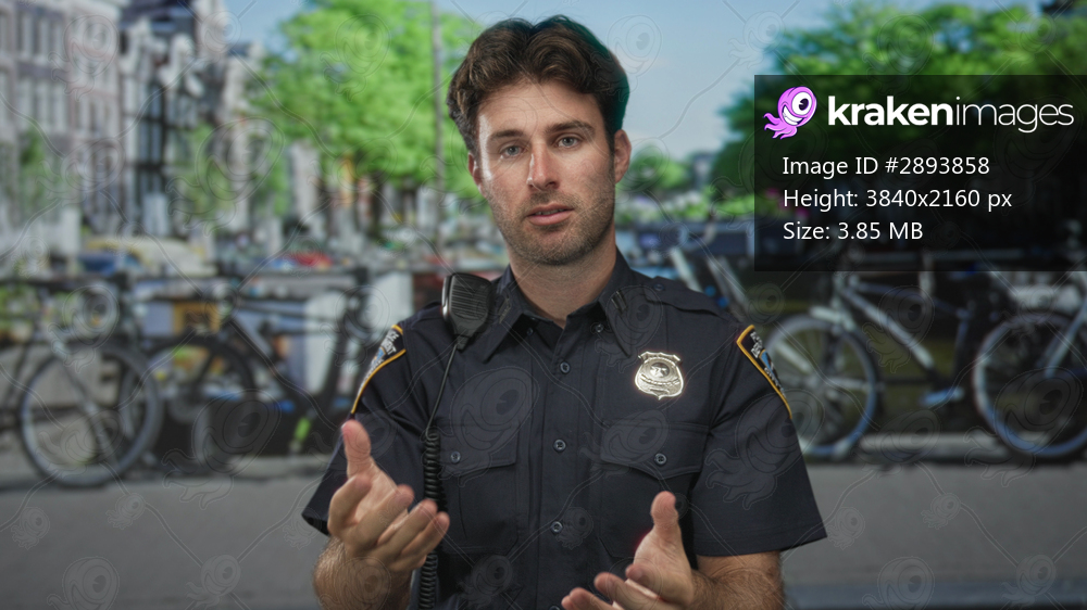 Man holding a radio microphone and gesturing with hands on a busy amsterdam street; public safety duty.