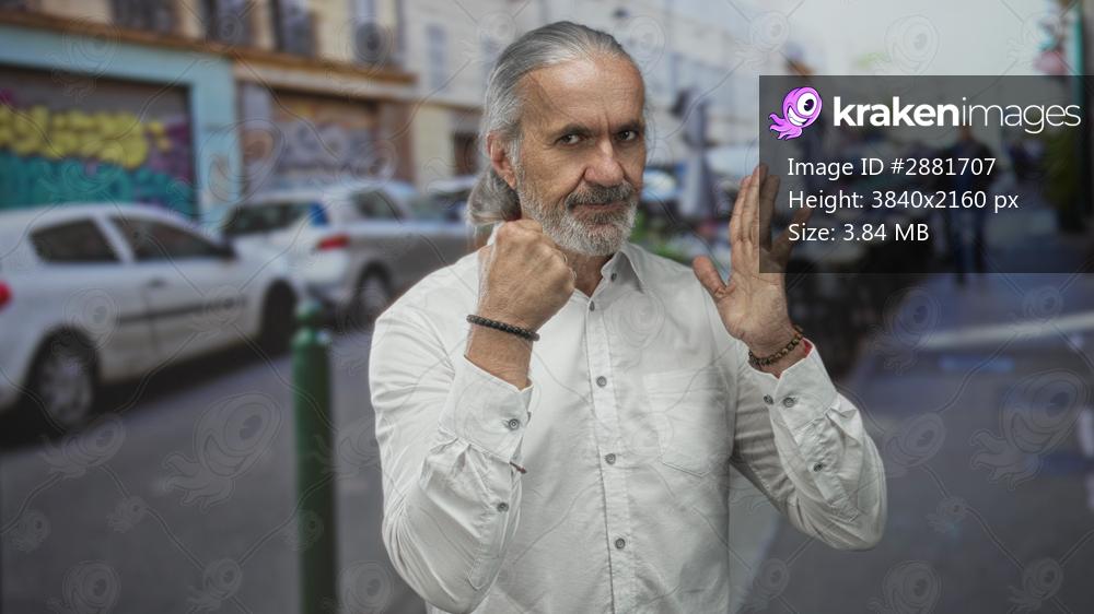 Man holding a raised fist on a busy city street, white shirt and bracelets visible; defiance resilience.
