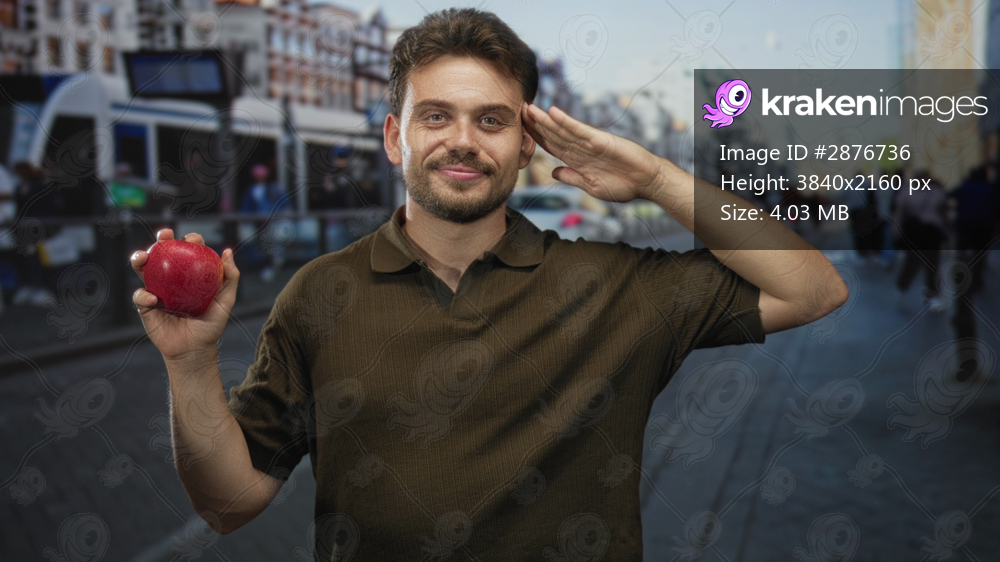 Man holding a red apple and saluting with his right hand on a busy city street near tram and pedestrians; cheerful optimism.