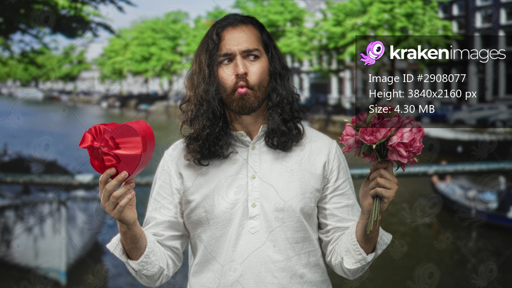 Man holding a red heart box and pink bouquet, puckering lips and shrugging shoulders on a street beside an amsterdam canal; romantic indecision.