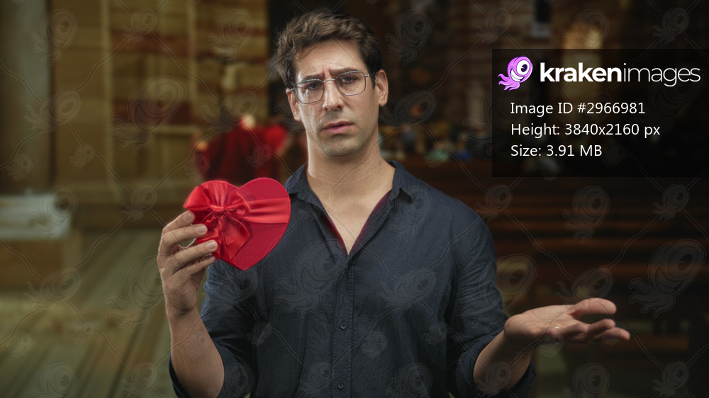 Man holding a red heart gift in his hand inside a church building, palms open in a pleading gesture; regret apology.