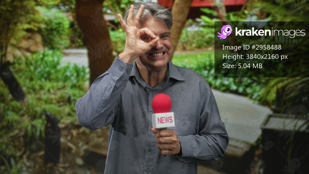 Man holding a red microphone makes an ok hand circle over one eye while smiling in a forest setting; playful reporting.