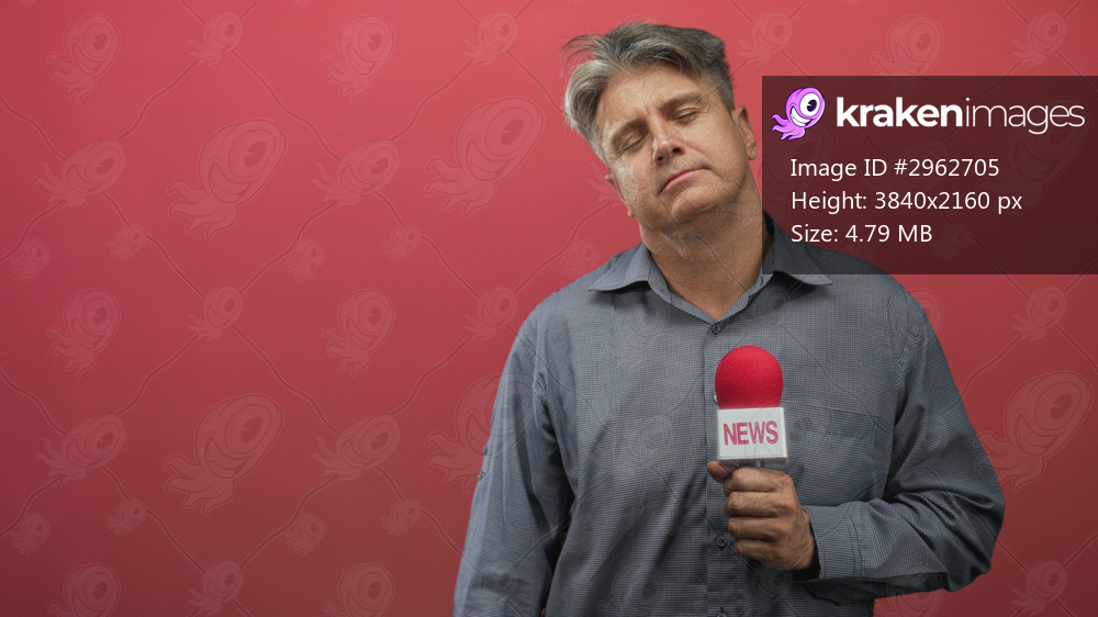 Man holding a red news microphone with hand visible and eyes closed while standing against a plain studio wall; weariness reflection.