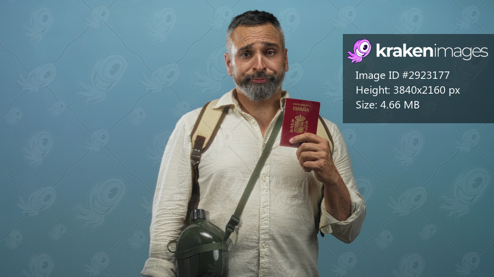 Man holding a red passport and canvas backpack strap in studio with blue backdrop; uncertainty travel.