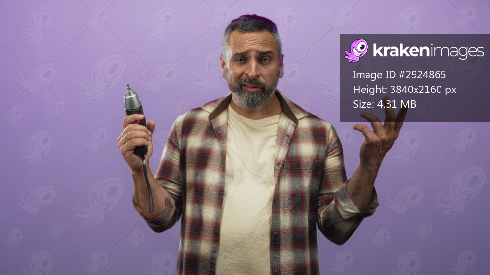 Man holding a rotary drill and pointing finger toward the tool in a purple studio, wearing plaid shirt and neutral tee; frustration.