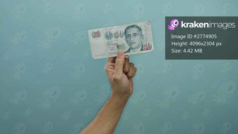 Man holding a singaporean banknote with hand against a blue wall background, emphasizing finance and currency in a simple setting.