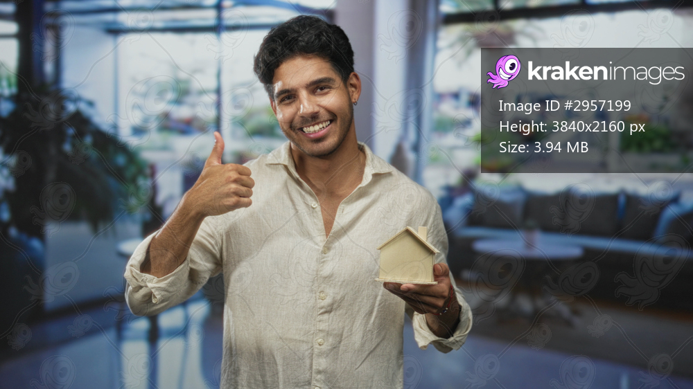 Man holding a small house model in one hand while giving a thumbs up and smiling in a building lobby next to sofa and table; confidence aspiration.