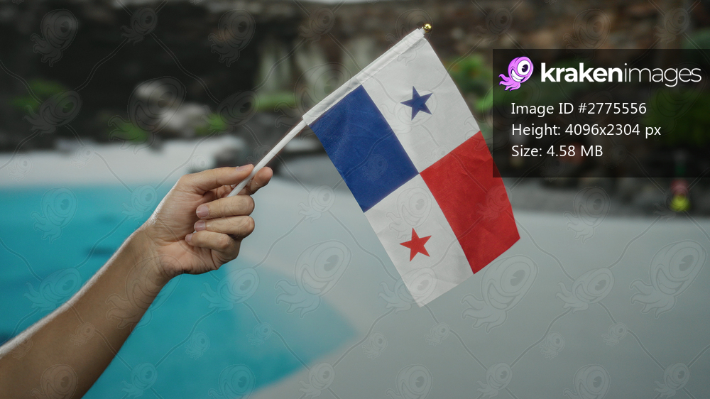Man holding a small panama flag by a resort pool, showcasing travel and leisure at a scenic hotel location.