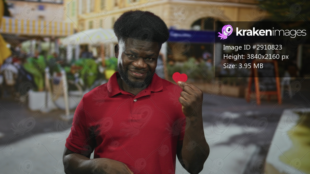 Man holding a small red heart between fingers on street terrace outside while smiling; quiet affection.