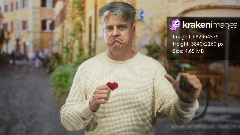 Man holding a small red heart on a cobbled street in front of a storefront, fist raised near chest, wearing a beige sweater; melancholy longing.