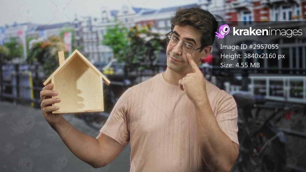 Man holding a small wooden house model in one hand while pointing finger to his glasses and looking skeptical on a street; home purchase doubt.