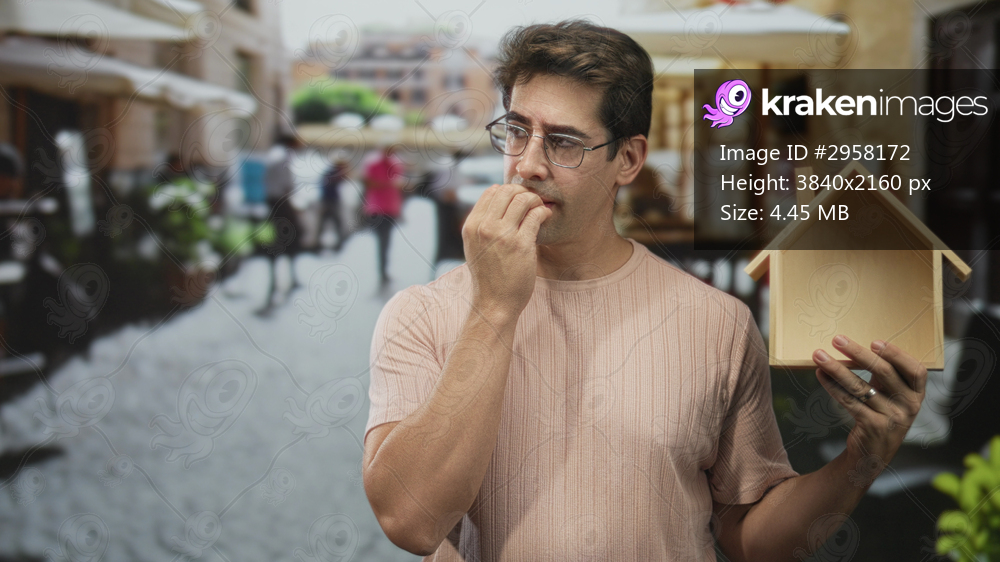 Man holding a small wooden house model in one hand while touching his mouth with fingers in a cobblestone street cafe scene; uncertainty.
