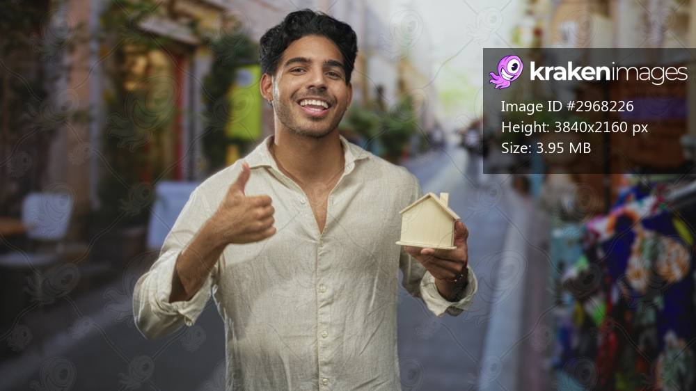 Man holding a small wooden house model, smiling and giving a thumbs up in a bustling street market with stalls and shoppers; homeownership optimism.