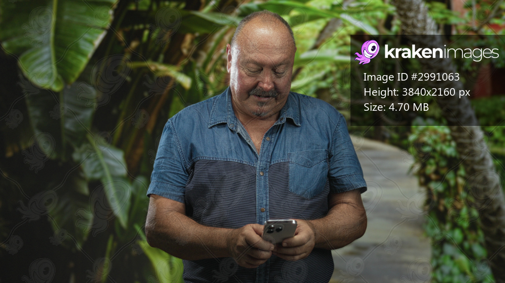 Man holding a smartphone in both hands, smiling and looking up on a garden pathway lined with palm leaves; calm reflection.