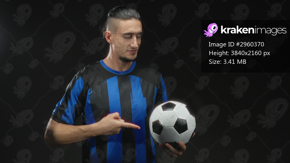 Man holding a soccer ball and points finger to ball in studio wearing blue striped jersey and smiling with thumbs up; confidence team spirit.