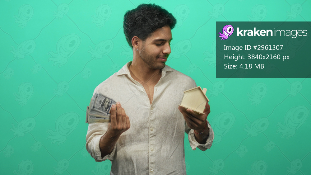 Man holding a stack of cash and a small wooden house model, smiling with closed eyes in studio; wealth aspiration confidence.