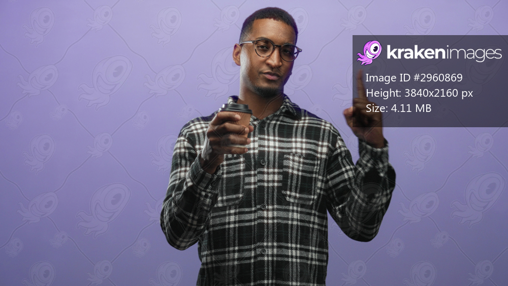 Man holding a takeaway coffee cup and pointing index finger upward in a studio with a purple backdrop; confidence focus.