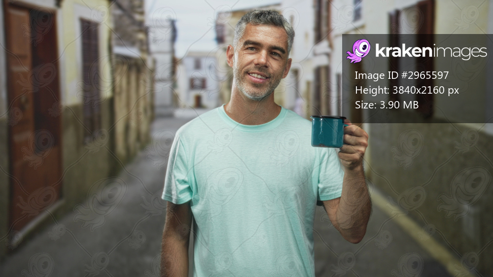 Man holding a teal mug with eyes closed, standing in a narrow old town street lined with shuttered buildings and cobblestone pavement; quiet contemplation. - Kraken Images
