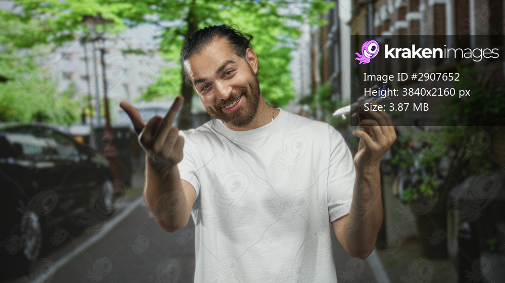 Man holding a toy airplane and showing middle finger to camera on a city street lined with trees and brick buildings; travel defiance.
