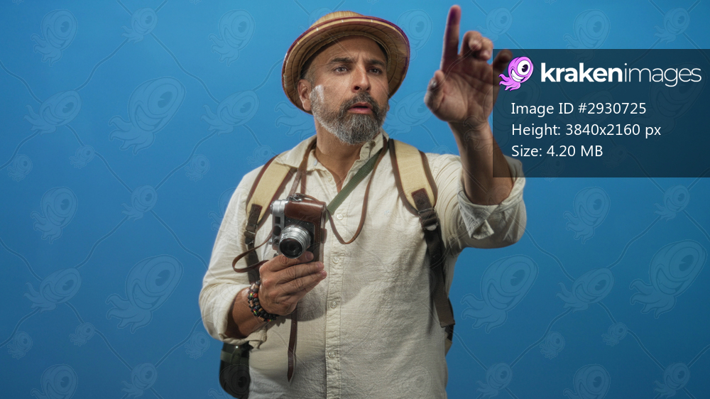 Man holding a vintage camera and backpack reaches hand forward in a blue studio; curiosity adventure.